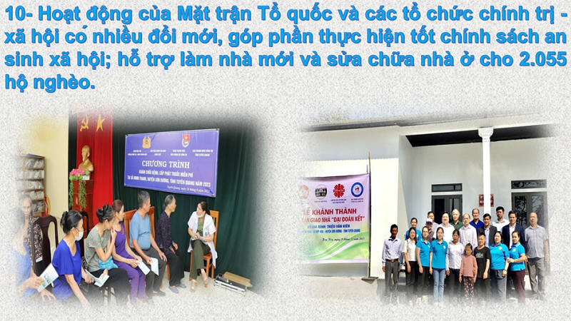 Mặt trận Tổ quốc, các tổ chức chính trị - xã hội tỉnh tiếp tục đổi mới nội dung, phương thức hoạt động: Tiếp tục triển khai hiệu quả Đề án xóa nhà ở tạm, dột nát cho hộ nghèo trên địa bàn tỉnh Tuyên Quang, giai đoạn 2021-2025: Năm 2023, đã thực hiện hỗ trợ 2.055 nhà (trong đó làm mới 1.692 nhà và sửa chữa 363 nhà), với tổng kinh phí trên 300 tỷ đồng. Quan tâm chăm lo, thực hiện tốt các chế độ, chính sách an sinh xã hội; tổ chức các hoạt động "Đền ơn, đáp nghĩa", "Uống nước nhớ nguồn" bảo đảm thiết thực, ý nghĩa. Tỷ lệ hộ nghèo năm 2023 giảm 3,81%, đưa tỷ lệ hộ nghèo (đa chiều) toàn tỉnh giảm xuống còn 15,09%. Tổ chức thành công Hội nghị Bí thư Tỉnh uỷ đối thoại với nông dân tỉnh Tuyên Quang; Hội nghị tiếp xúc, đối thoại giữa Trưởng Đoàn đại biểu Quốc hội tỉnh và Đoàn đại biểu Quốc hội tỉnh với công nhân, lao động; Hội nghị Chủ tịch Ủy ban nhân dân tỉnh đối thoại với thanh niên. Tổ chức Đại hội Hội Nông dân, Đại hội Công đoàn cấp huyện, cấp tỉnh nhiệm kỳ 2023 - 2028 và chuẩn bị Đại hội Mặt trận Tổ quốc Việt Nam các cấp, nhiệm kỳ 2024-2029./.