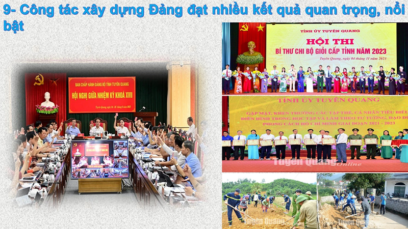 Tổ chức thành công các Hội nghị, Hội thi từ cấp cơ sở đến cấp tỉnh: Hội nghị giữa nhiệm kỳ, đánh giá tình hình triển khai, kết quả công tác lãnh đạo, chỉ đạo thực hiện Nghị quyết Đại hội Đảng bộ tỉnh lần thứ XVII. Hội thi Bí thư chi bộ giỏi cấp tỉnh tạo sức lan toả mạnh mẽ, nâng cao nghiệp vụ công tác đảng cho đội ngũ bí thư chi bộ, nâng cao chất lượng sinh hoạt chi bộ. Sơ kết 02 năm thực hiện Kết luận số 01-KL/TW ngày 18/5/2021 của Bộ Chính trị và gặp mặt, khen thưởng các tập thể, cá nhân tiêu biểu, điển hình trong học tập và làm theo tư tưởng, đạo đức, phong cách Hồ Chí Minh giai đoạn 2021-2023, có 1.071 lượt tập thể, cá nhân được khen thưởng ở các cấp. Chỉ đạo thực hiện phong trào “ba cùng” với Nhân dân đi vào nền nếp, mang lại nhiều kết quả thiết thực, đến nay đã có trên 3.100 lượt chi bộ, đảng bộ cơ sở, trên 126.000 lượt đảng viên, cán bộ, công chức, viên chức, chiến sỹ lực lượng vũ trang cấp tỉnh, cấp huyện, cấp xã xuống cơ sở tham gia hoạt động với Nhân dân.