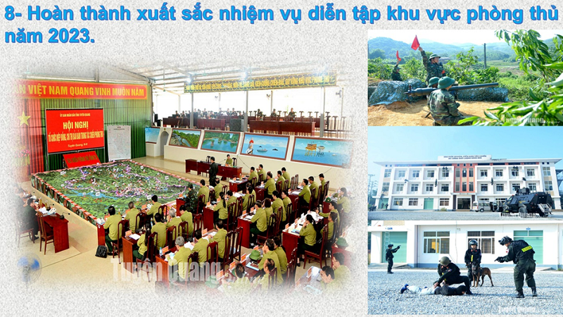Diễn tập khu vực phòng thủ tỉnh Tuyên Quang năm 2023 được tổ chức với quy mô 1 bên, 3 cấp (tỉnh, huyện, xã) với 3 giai đoạn, gồm trên 30 nội dung diễn tập. Đây là cuộc diễn tập khu vực phòng thủ có quy mô lớn nhất từ trước đến nay cả về nội dung, phương pháp, thời gian và phạm vi tổ chức; huy động nhiều loại trang, thiết bị, khí tài, phương tiện mới, hiện đại và ứng dụng nhiều giải pháp công nghệ thông tin, chuyển đổi số tiên tiến. Ban Chỉ đạo diễn tập khu vực phòng thủ Quân khu II đánh giá: Cuộc diễn tập khu vực phòng thủ tỉnh Tuyên Quang ở 3 cấp đã hoàn thành xuất sắc nhiệm vụ.