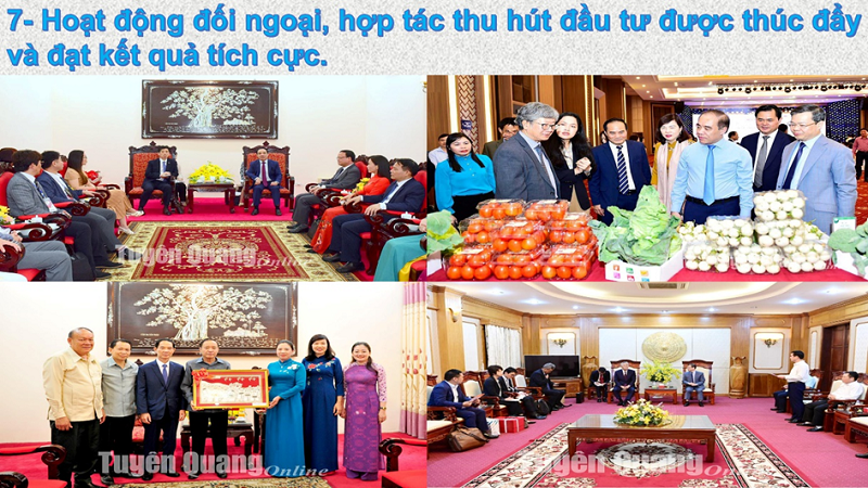 Các hoạt động giao lưu, hợp tác, xúc tiến đầu tư, thương mại, du lịch được mở rộng và tăng cường; các đoàn công tác của lãnh đạo tỉnh tại nước ngoài đạt nhiều kết quả thực chất. Đón tiếp 34 đoàn khách nước ngoài với 297 lượt người tới thăm, làm việc tại tỉnh. Hoạt động ngoại giao văn hóa được tăng cường, góp phần lan tỏa các giá trị văn hóa, di sản, vẻ đẹp Tuyên Quang, tạo điểm nhấn, ấn tượng và sức hấp dẫn với bạn bè quốc tế.