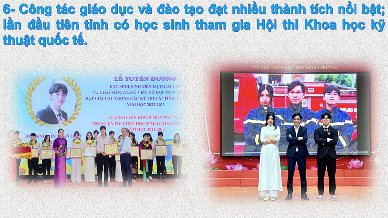 Chất lượng giáo dục đại trà và giáo dục mũi nhọn đạt nhiều kết quả tích cực; duy trì thành quả phổ cập giáo dục các bậc học; tỷ lệ huy động trẻ đi nhà trẻ đạt 49,3%, tăng 3,1% so với kế hoạch. Triển khai thực hiện tốt chương trình giáo dục phổ thông mới; tổ chức kỳ thi tốt nghiệp trung học phổ thông đảm bảo an toàn, nghiêm túc, đạt kết quả cao, tỷ lệ tốt nghiệp đạt 99,26%. Tỉnh có 02 học sinh đoạt giải Nhất Cuộc thi Khoa học kỹ thuật cấp quốc gia và tham dự Hội thi Khoa học kỹ thuật Quốc tế năm 2023 diễn ra tại Hoa Kỳ; một số học sinh đạt giải cao tại các cuộc thi quốc tế và khu vực như: Cuộc thi đổi mới phát minh Quốc tế ICAN 2023 đạt 01 Huy chương vàng và 02 giải đặc biệt; Cuộc thi toán học quốc tế Hồng Kông đạt 06 Huy chương vàng.