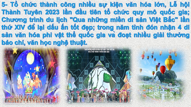 Chương trình Khai mạc năm du lịch tỉnh Tuyên Quang năm 2023, đón nhận "Giải thưởng phong cảnh thành phố Châu Á" cho Quảng trường Nguyễn Tất Thành - Tinh hoa của núi rừng và Lễ hội Khinh khí cầu quốc tế lần thứ II năm 2023; Chương trình du lịch “Qua những miền di sản Việt Bắc” lần thứ XIV được tổ chức với nội dung đa dạng, hấp dẫn, để lại ấn tượng sâu sắc đối với đại biểu, nhân dân và du khách.