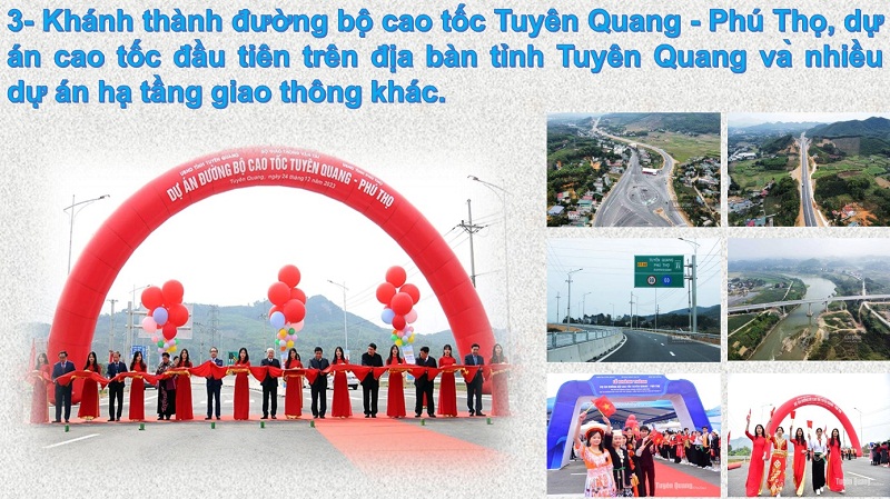 Ngày 24/12/2023, cao tốc Tuyên Quang - Phú Thọ kết nối cao tốc Nội Bài - Lào Cai đã được tổ chức Lễ khánh thành. Dự án cao tốc Tuyên Quang - Phú Thọ là một trong những công trình trọng điểm quốc gia có ý nghĩa quan trọng đối với phát triển kinh tế - xã hội, tăng cường bảo đảm quốc phòng - an ninh với các tỉnh phía bắc nói chung và các tỉnh Tuyên Quang, Hà Giang, Phú Thọ nói riêng; đánh dấu bước phát triển đột phá của tỉnh trong phát triển hạ tầng. Dự án Cao tốc Tuyên Quang - Phú Thọ dài 40,2 km kết nối với cao tốc Nội Bài - Lào Cai có 4 làn xe, vận tốc khai thác tối đa 90km/h với tổng mức đầu tư 3.753 tỷ đồng khởi công từ tháng 2 năm 2021. Dự án hoàn thành, là dấu mốc quan trọng tạo thời cơ mới, khí thế mới và xung lực mạnh mẽ thúc đẩy phát triển kinh tế - xã hội của tỉnh. Tuyến cao tốc đã mở ra không gian phát triển mới, giúp mở rộng liên kết vùng, tăng tính cạnh tranh về phát triển kinh tế - xã hội giữa các vùng; tháo gỡ được điểm nghẽn về giao thông đối ngoại của tỉnh Tuyên, giúp giảm tải cho tuyến Quốc lộ 2 và rút ngắn thời gian di chuyển từ Tuyên Quang về Thủ đô Hà Nội và tăng cường kết nối giữa các tỉnh trong khu vực miền núi phía Bắc.