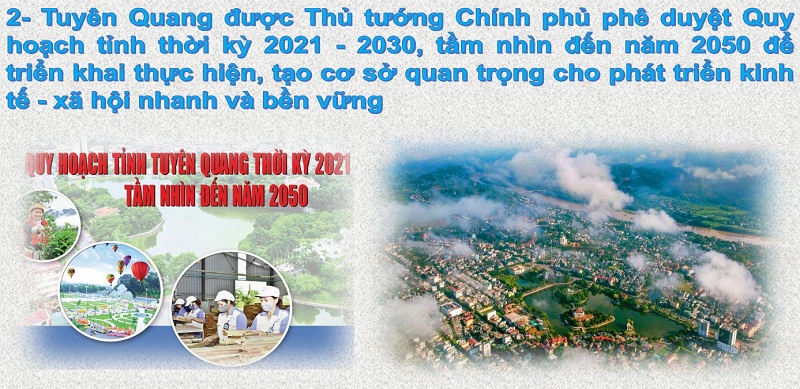 Tỉnh hoàn thành quy hoạch chi tiết, quy hoạch đô thị động lực, trục phát triển, tạo động lực đến năm 2030 Tuyên Quang là tỉnh phát triển khá, toàn diện, bao trùm và bền vững trong vùng Trung du và miền núi Bắc bộ. Tập trung phát triển ba trụ cột kinh tế, hình thành bốn cực tăng trưởng. Kinh tế phát triển xanh và năng động, nhanh và bền vững trên cơ sở đẩy mạnh ứng dụng khoa học, công nghệ và đổi mới sáng tạo để nâng cao năng suất, chất lượng, hiệu quả và sức cạnh tranh. Không gian kinh tế - xã hội được tổ chức, phát triển hài hòa, hợp lý gắn với đẩy mạnh chuyển dịch cơ cấu kinh tế; bảo đảm môi trường, sinh thái. Xây dựng Tuyên Quang là tỉnh điển hình về phát triển kinh tế lâm nghiệp bền vững, ứng dụng công nghệ cao và trung tâm sản xuất, chế biến gỗ của vùng Trung du và miền núi Bắc bộ.