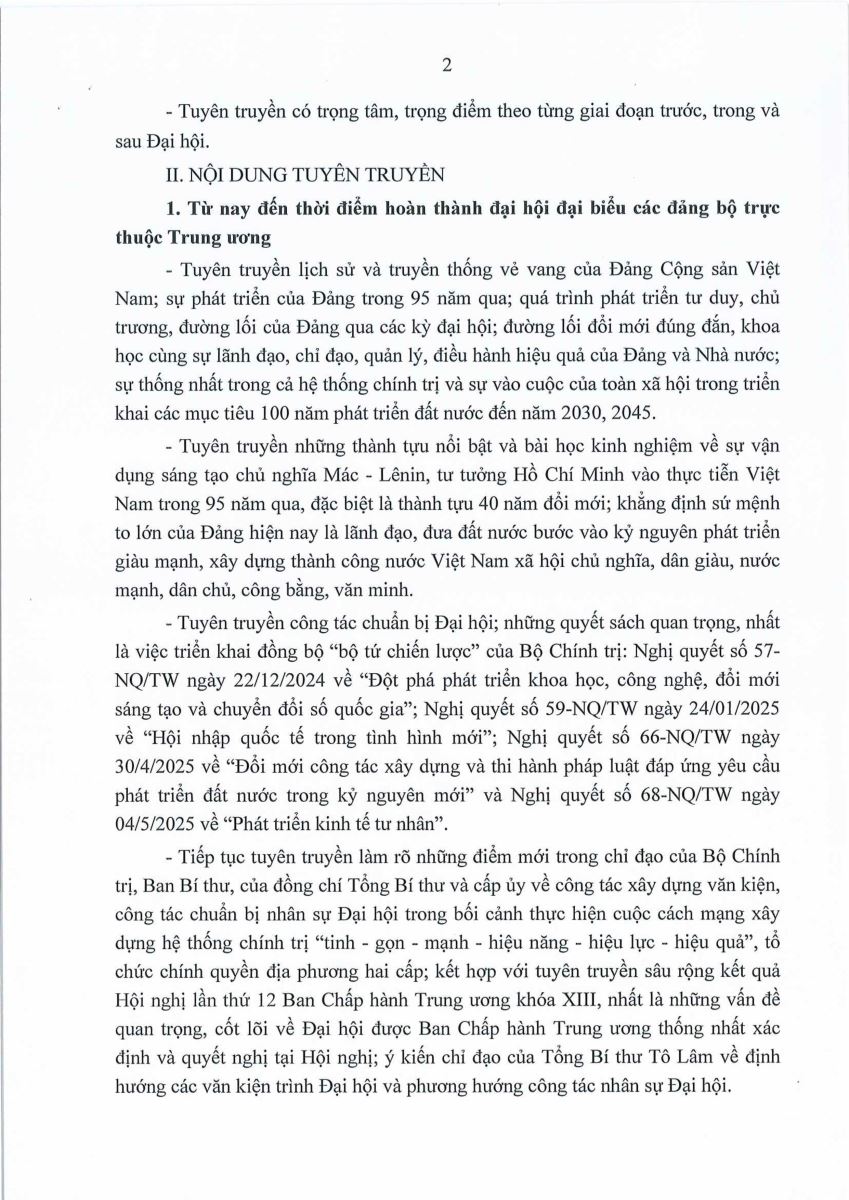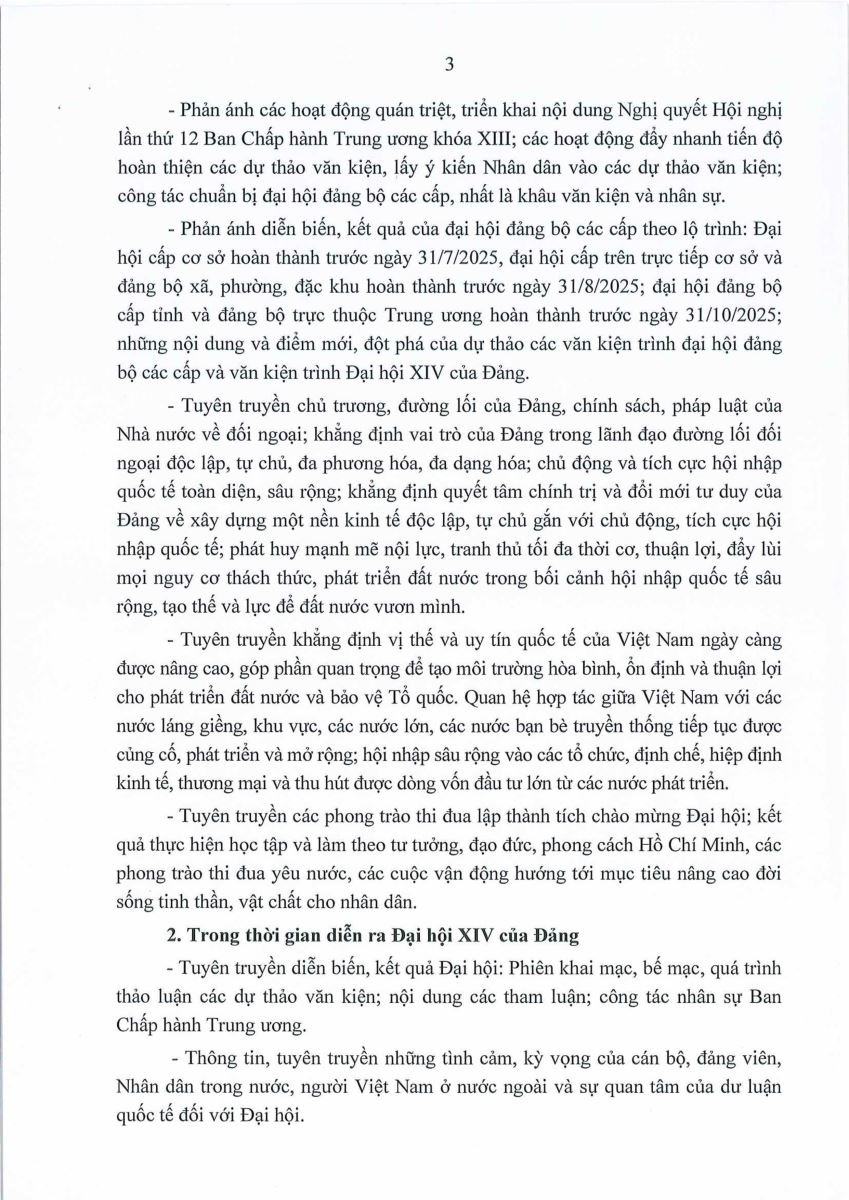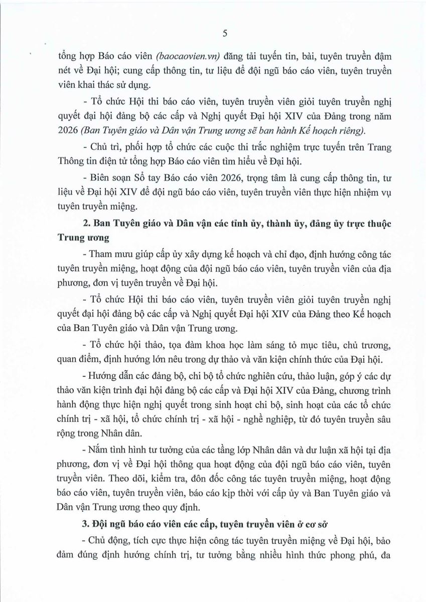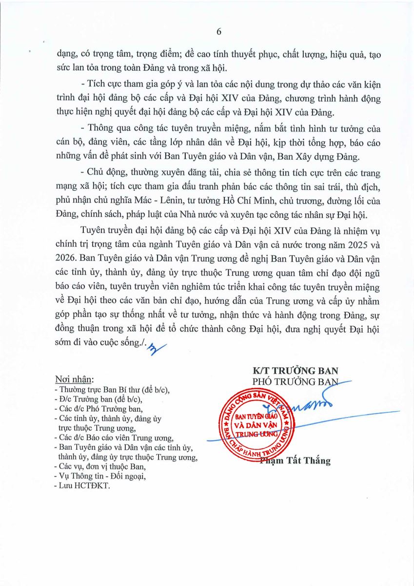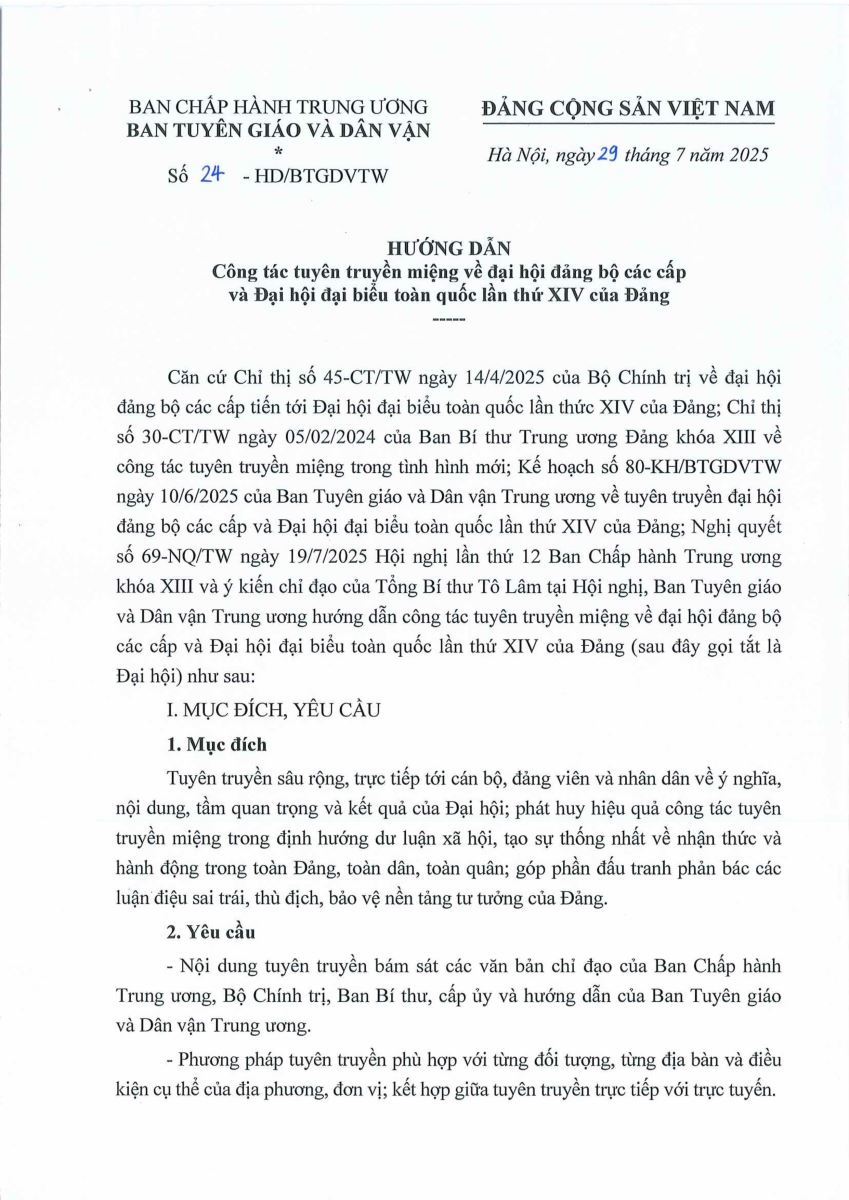 Hướng dẫn số 24-HD/BTGDVTW ngày 29/7/2025 của Ban Tuyên giáo và Dân vận Trung ương về công tác tuyên truyền miệng về đại hội đảng bộ các cấp và Đại hội đại biểu toàn quốc lần thứ XIV của Đảng
