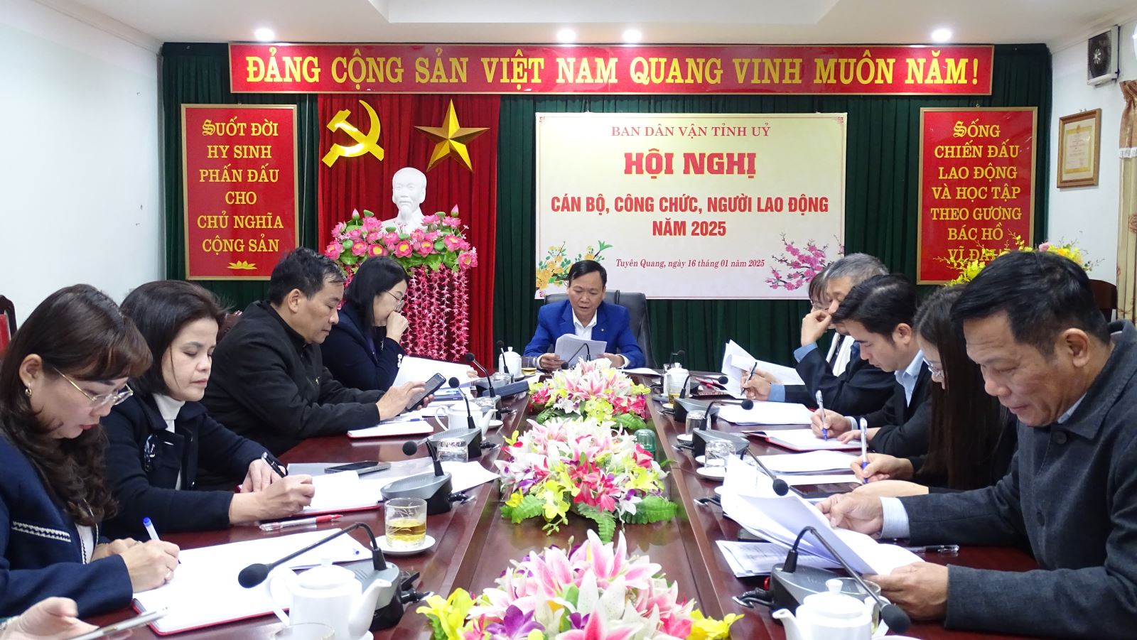 Ngày 16/01/2025, Ban Dân vận Tỉnh ủy tổ chức Hội nghị cán bộ, công chức, người lao động năm 2025. Dự Hội nghị các đồng chí Lãnh đạo Ban Dân vận Tỉnh ủy, Chủ tịch Công đoàn cơ sở cùng toàn thể công chức, người lao động trong cơ quan.