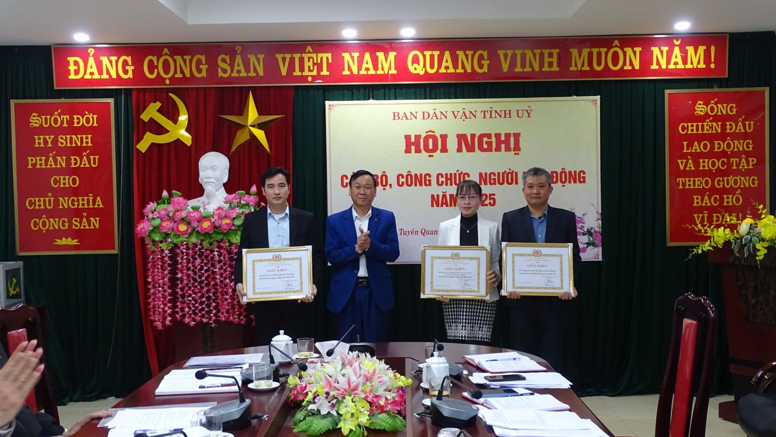 Hội nghị kiểm điểm việc thực hiện đường lối, chủ trương của Đảng, chính sách, pháp luật của Nhà nước về công tác dân vận và việc thực hiện dân chủ trong cơ quan; kiểm điểm việc thực hiện nghị quyết hội nghị cán bộ, công chức, viên chức, người lao động năm 2024; thực hiện các nội dung công khai theo quy định; phát động thi đua, đăng ký danh hiệu thi đua năm 2025. Năm 2024, Ban Dân vận Tỉnh ủy phối hợp Công đoàn cơ sở vận động cán bộ, đoàn viên hoàn thành tốt nhiệm vụ chuyên môn được giao, 100% cán bộ, công chức, người lao động đạt danh hiệu lao động tiên tiến, có 04 cá nhân hoàn thành xuất sắc nhiệm vụ. Tại Hội nghị, Lãnh đạo Ban trao giấy khen cho các tập thể, cá nhân đạt danh hiệu lao động tiên tiến, chiến sĩ thi đua cấp cơ sở.
