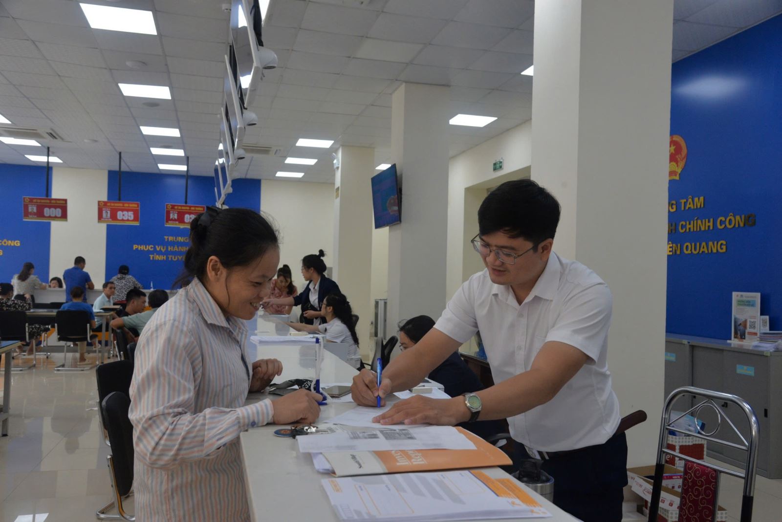 Cán bộ tại Trung tâm Phục vụ hành chính công tỉnh Tuyên Quang niềm nở hỗ trợ người dân.
