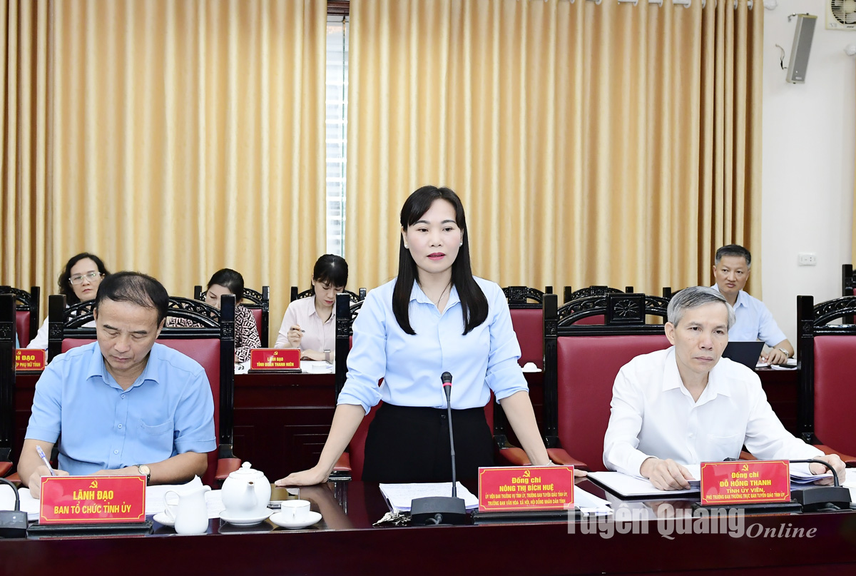 Phát biểu tại buổi làm việc, đồng chí Trưởng ban Tuyên giáo Tỉnh ủy, Trưởng ban Văn hóa - Xã hội HĐND tỉnh Nông Thị Bích Huệ khẳng định, thời gian qua, việc nghiên cứu, vận dụng và phát triển sáng tạo tư tưởng Hồ Chí Minh trong xây dựng Đảng Cộng sản Việt Nam thời kỳ đổi mới ở Tuyên Quang đã đạt được những kết quả quan trọng. Việc kiện toàn, sắp xếp tổ chức bộ máy, nâng cao hiệu lực, hiệu quả hoạt động của các cơ quan, tổ chức, đơn vị trong hệ thống chính trị của tỉnh đã có nhiều đổi mới, chuyển biến rõ nét, triển khai thực hiện quyết liệt với quyết tâm chính trị cao.