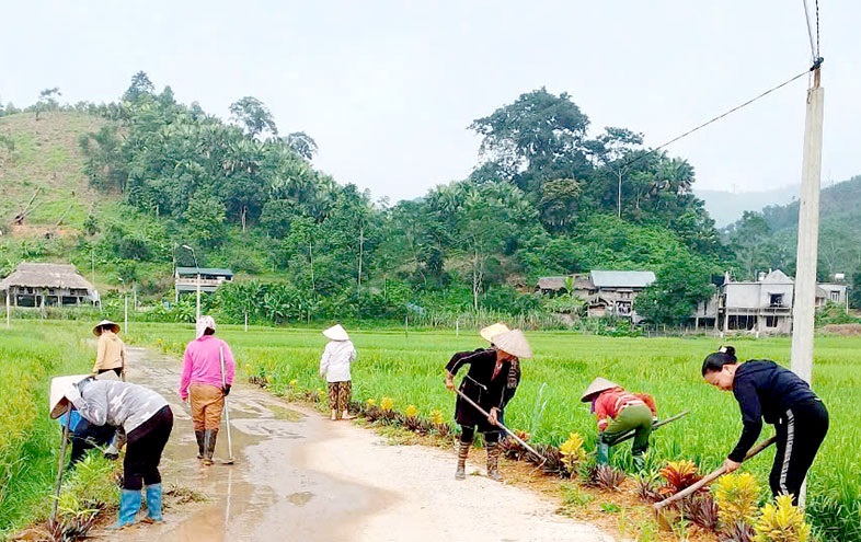 Bà con Nhân dân xã Bằng Cốc trồng hoa, dọn dẹp vệ sinh tuyến đường bê tông nông thôn.