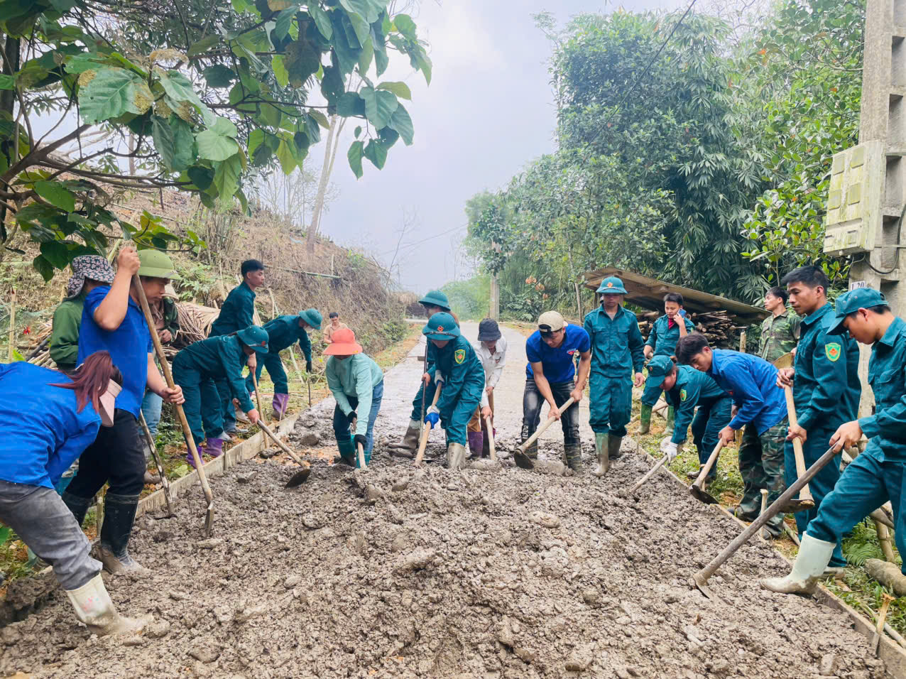 Đoàn viên thanh niên và lực lượng dân quân xã tham gia với Nhân dân thôn Khuổi Đinh, xã Trung Hà, huyện Chiêm Hóa làm đường bê tông nông thôn