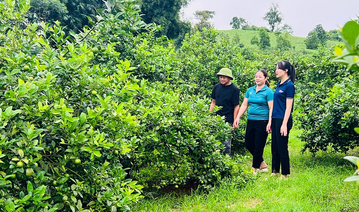 Lãnh đạo UBND xã Minh Khương thăm mô hình trồng chanh tứ quý trên đất đồi của gia đình anh Nguyễn Minh Hiếu, thôn Thăm Bon.