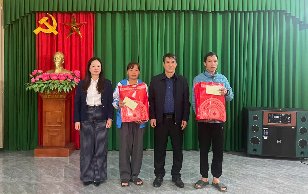 Đồng chí Lê Mạnh Cường, Phó Trưởng Ban Tuyên giáo và Dân vận Tỉnh ủy và Phó Bí thư Đảng ủy xã Kiên Đài và tặng quà cho một số hộ gia đình