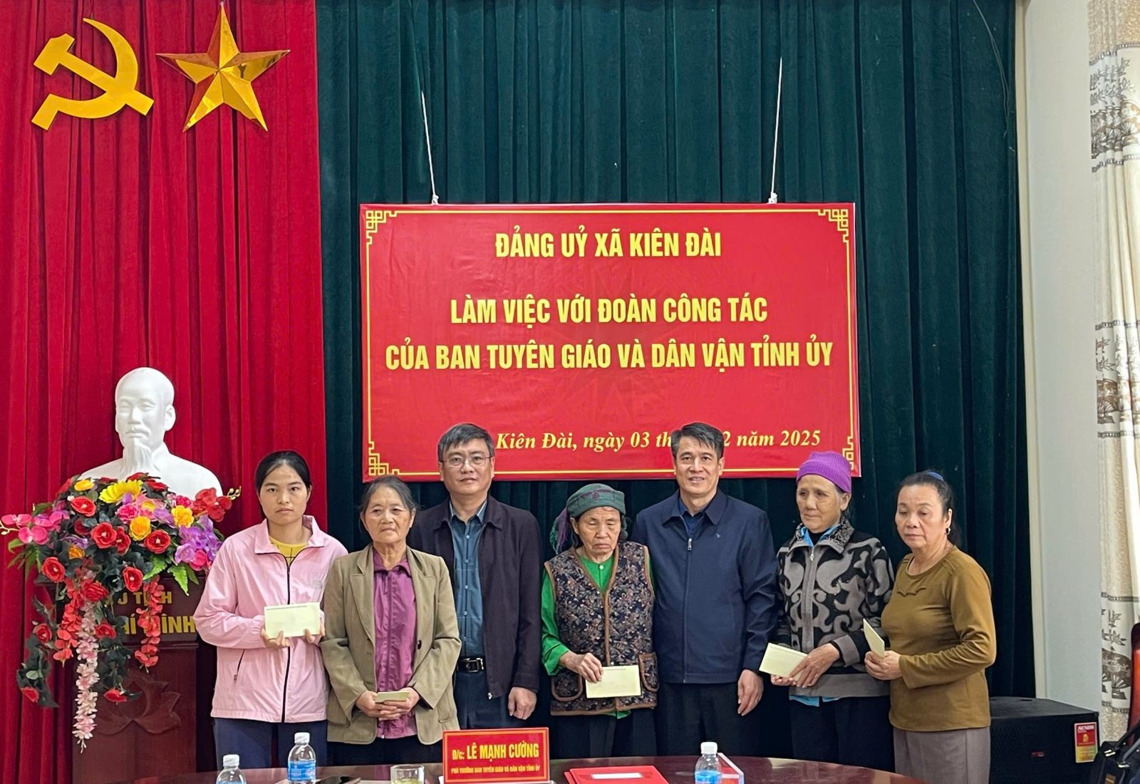Nhân chuyến công tác, Đoàn đã đến thăm hỏi, động viên và trao tặng quà cho một số hộ gia đình có hoàn cảnh đặc biệt khó khăn tại các xã. Đây là hoạt động thể hiện tinh thần trách nhiệm, sự quan tâm của Ban Tuyên giáo và Dân vận Tỉnh ủy đối với đời sống nhân dân, góp phần lan tỏa những giá trị nhân văn, củng cố niềm tin của nhân dân đối với Đảng và chính quyền địa phương.