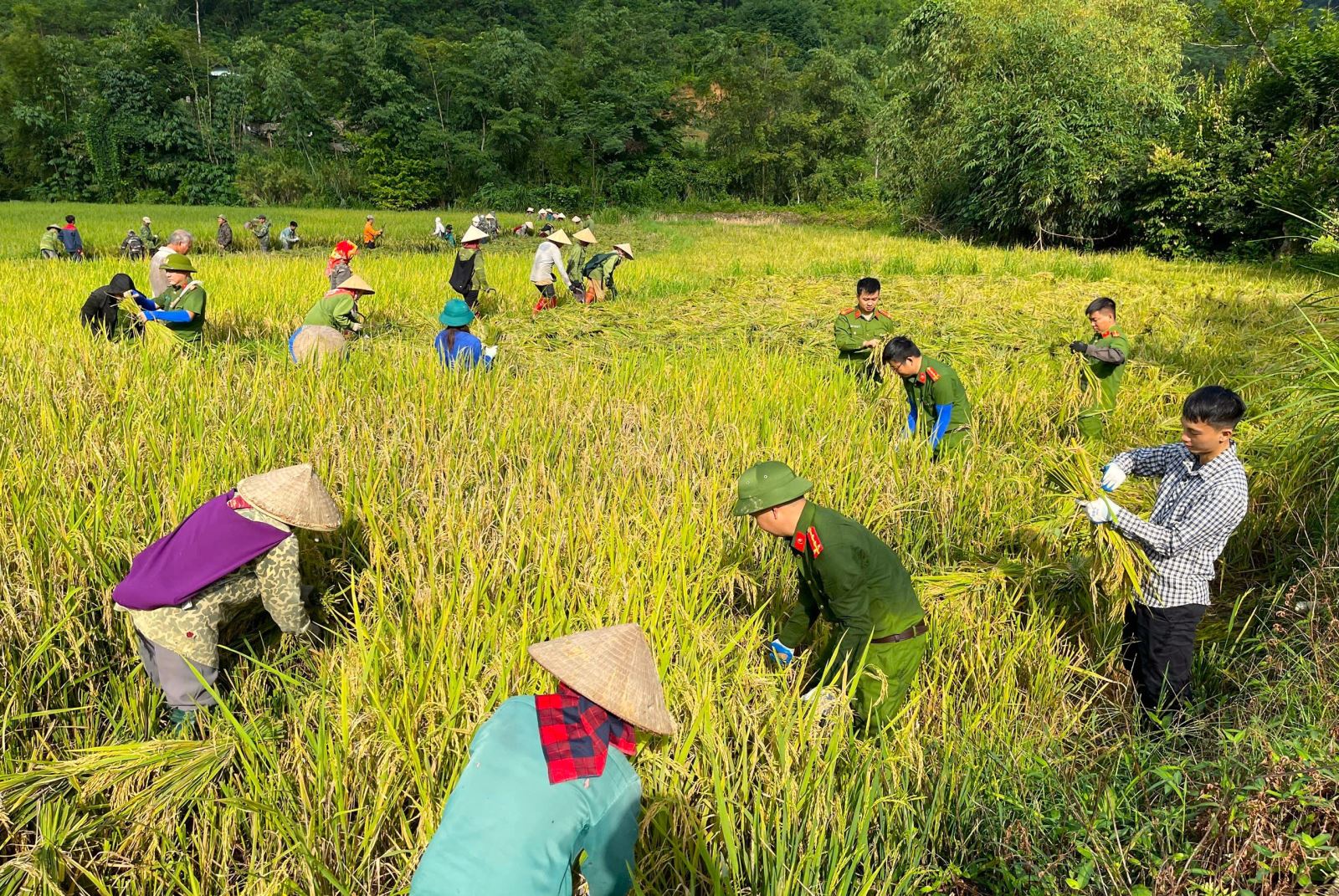 Cán bộ, công chức, lực lượng Công an xã Kiên Đài giúp Nhân dân thu hoạch lúa sau cơn bão số 10 (Bualoi)