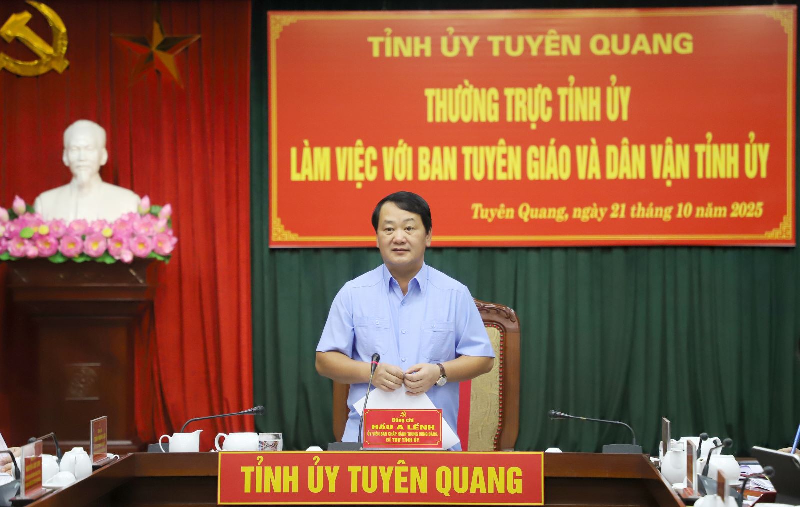 Qua nghe báo cáo của Ban Tuyên giáo và Dân vận Tỉnh ủy và ý kiến thảo luận của các đại biểu, phát biểu kết luận buổi làm việc, Bí thư Tỉnh ủy Hầu A Lềnh nhấn mạnh: Trong bối cảnh sáp nhập tỉnh, thực hiện chính quyền địa phương 2 cấp, thời gian qua Ban Tuyên giáo và Dân vận Tỉnh ủy đã cố gắng, nỗ lực hoàn thành tốt nhiệm vụ chính trị theo chức năng, nhiệm vụ được giao; kịp thời phản ánh những sự kiện lớn của Trung ương, của tỉnh đến với Nhân dân tạo sức lan tỏa tích cực trong dư luận, cộng đồng.