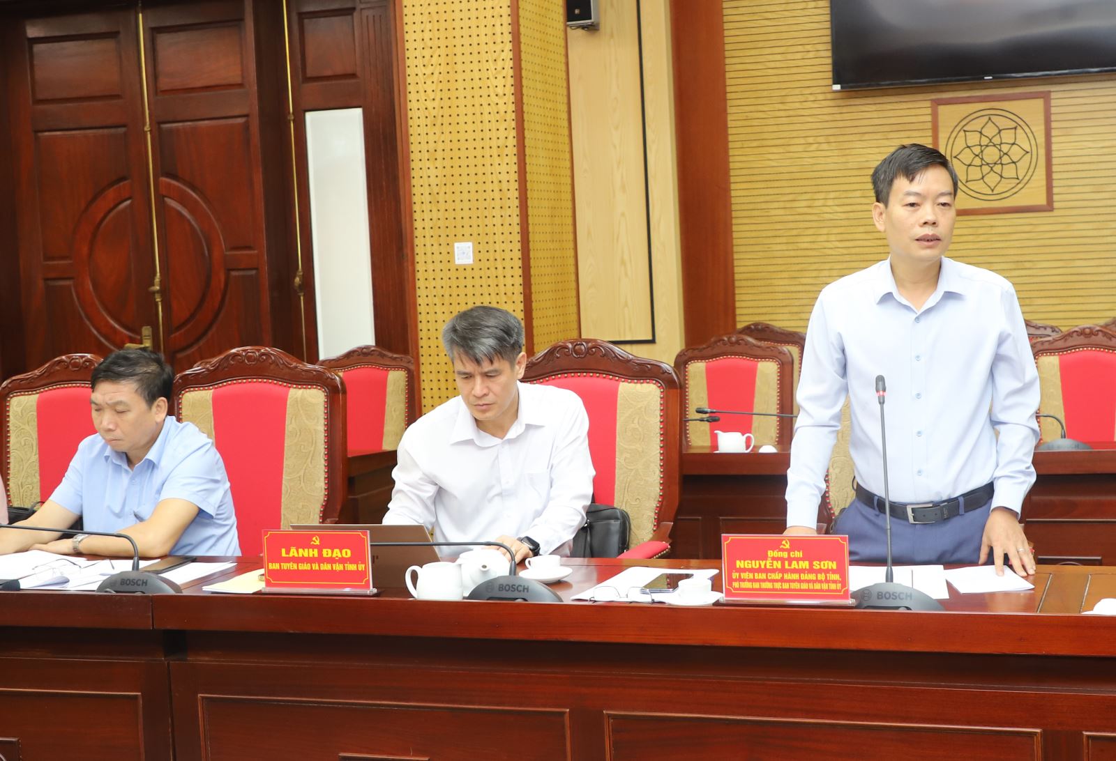 Phó Trưởng ban Thường trực Ban Tuyên giáo và Dân vận Tỉnh ủy Nguyễn Lam Sơn thảo luận tại buổi làm việc.
