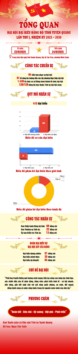 TGDV - Đại hội đại biểu Đảng bộ tỉnh Tuyên Quang lần thứ I, nhiệm kỳ 2025 - 2030 diễn ra trong 3 ngày, từ ngày 22/9 đến ngày 24/9/2025, tại Trung tâm Hội nghị tỉnh Tuyên Quang