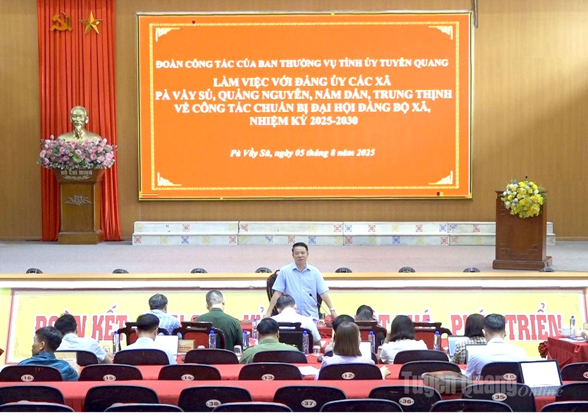 TGDV- Ngày 5/8 đồng chí Trần Mạnh Lợi, Ủy viên BTV Tỉnh ủy, Trưởng Ban Tuyên giáo Tỉnh ủy cùng đồng công tác đã có buổi làm việc với Đảng ủy các xã Pà Vầy Sủ, Quảng Nguyên, Nấm Dẩn, Trung Thịnh về công tác chuẩn bị tổ chức Đại hội Đảng bộ xã nhiệm kỳ 2025 - 2030.Tại buổi làm việc lãnh đạo các xã đã báo cáo khái quát tiến độ, nội dung triển khai, trong đó nhấn mạnh việc xây dựng các văn kiện đại hội, xác định rõ mục tiêu, nhiệm vụ và giải pháp trọng tâm cho nhiệm kỳ tới