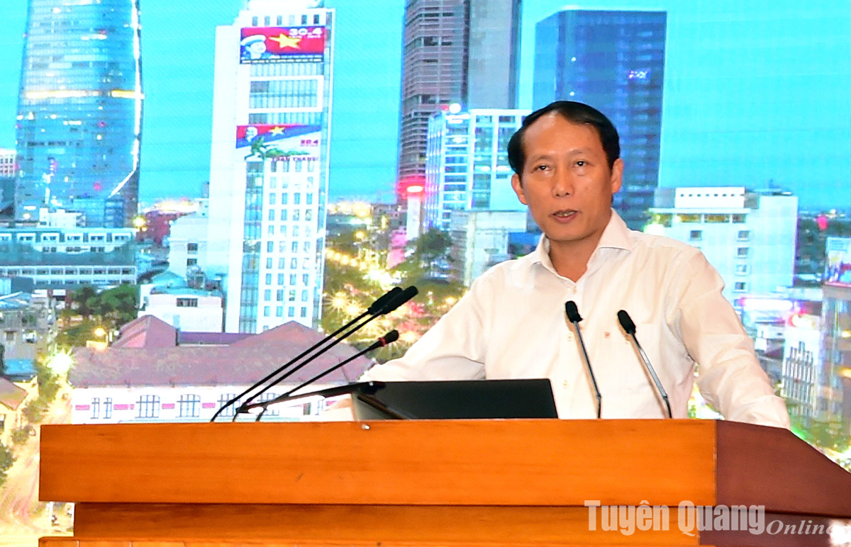 Đồng chí Văn Tiến Bằng, Phó Giám đốc Trung tâm Thông tin công tác tuyên giáo, Ban Tuyên giáo Trung ương trình bày chuyên đề tại hội nghị. Ảnh: Thanh Phúc