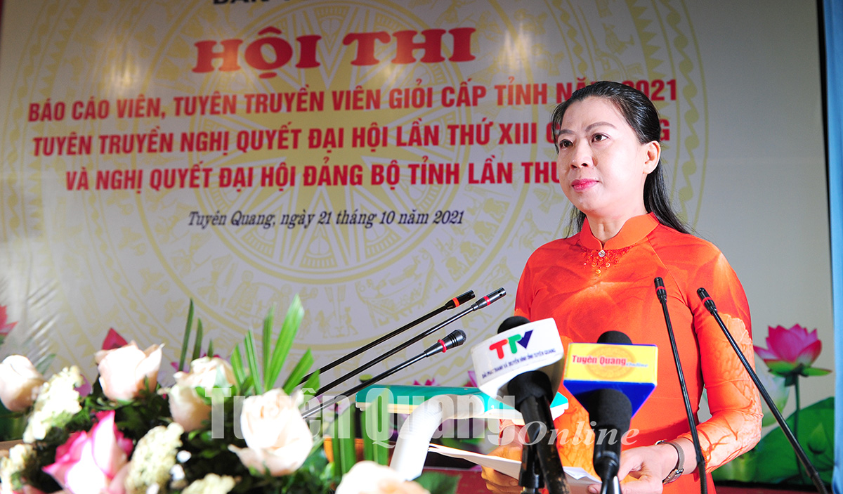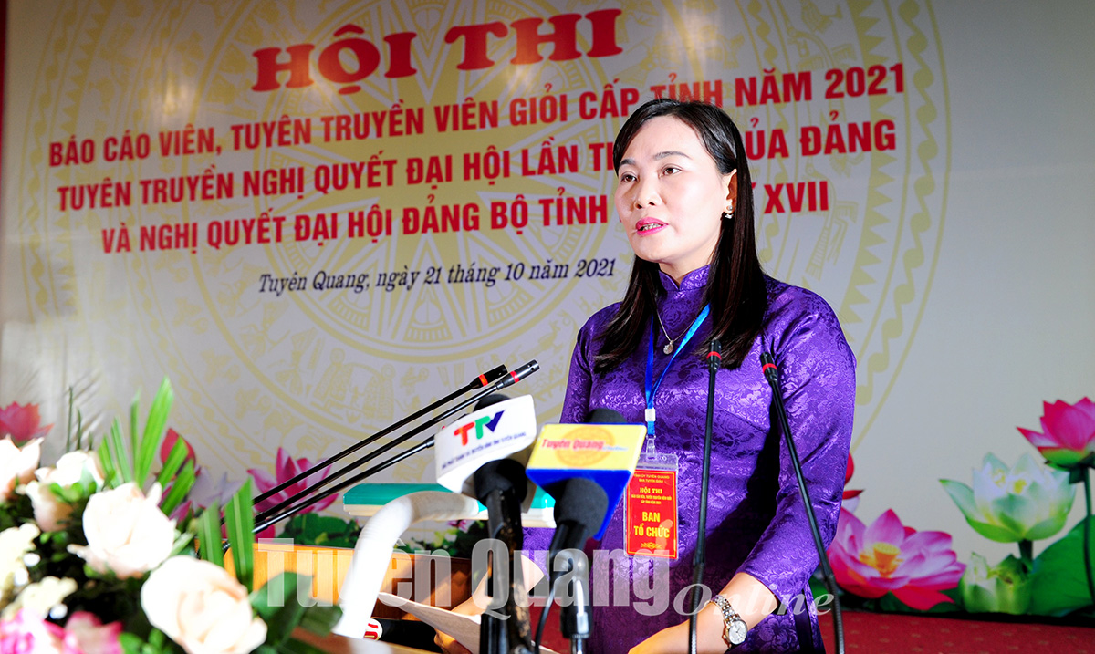 Phát biểu chỉ đạo tại Hội thi, đồng chí Lê Thị Kim Dung, Phó Bí thư Thường trực Tỉnh ủy nhấn mạnh, Hội thi có ý nghĩa rất quan trọng góp phần tạo sự thống nhất cao trong nhận thức và hành động của toàn Đảng bộ; tuyên truyền một cách sinh động, hiệu quả nhất Nghị quyết Đại hội đại biểu toàn quốc lần thứ XIII của Đảng và Nghị quyết Đại hội đại biểu Đảng bộ tỉnh lần thứ XVII đến cán bộ, đảng viên và nhân dân với quyết tâm thực hiện thắng lợi mục tiêu nghị quyết đại hội đảng các cấp đề ra. Đồng thời, đây là diễn đàn bổ ích để mỗi đồng chí báo cáo viên, tuyên truyền viên tự trau dồi kinh nghiệm, kiến thức, phục vụ tốt hơn nhiệm vụ chính trị được giao. Đồng chí đề nghị Hội thi phải được tổ chức một cách nghiêm túc, thiết thực, hiệu quả, tránh hình thức, phô trương. Để hội thi thành công tốt đẹp đề nghị ban giám khảo phải thực sự công tâm, khách quan, lựa chọn được những thí sinh xứng đáng và người chiến thắng trong cuộc thi phải thực sự là người có bản lĩnh, trí tuệ, khả năng nghiên cứu, phương pháp truyền đạt tốt xứng đáng với danh hiệu đạt được.