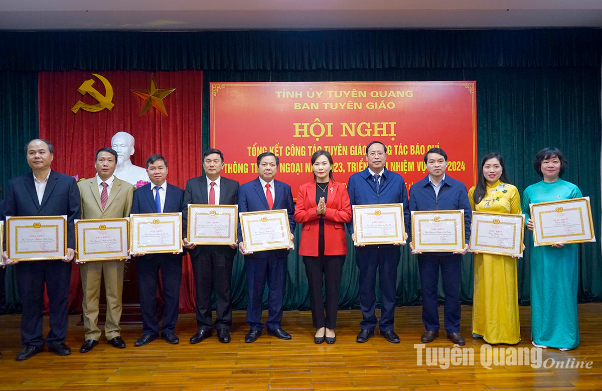 Nhân dịp này, Ban Tuyên giáo Trung ương tặng Kỷ niệm chương “Vì sự nghiệp Tuyên giáo” cho 2 cá nhân; Ban Tuyên giáo Tỉnh ủy tặng Giấy khen cho 24 tập thể, 37 cá nhân có thành tích xuất sắc trong công tác Tuyên giáo và công tác giáo dục lý luận chính trị năm 2023.