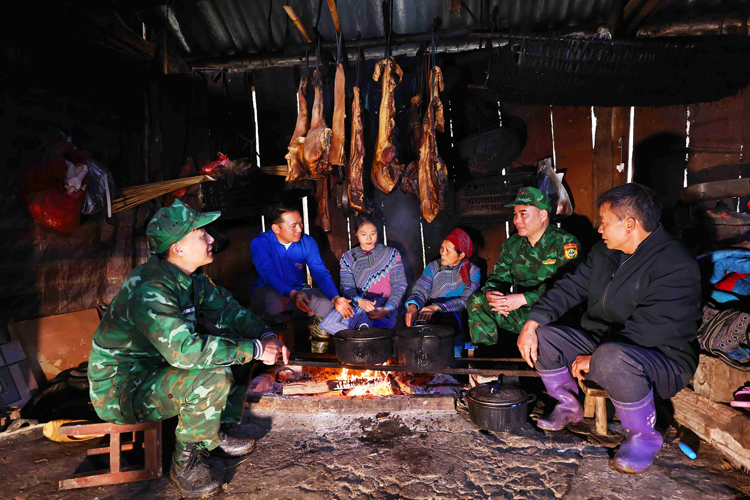 Cán bộ, chiến sĩ Đồn Biên phòng Pha Long (xã Pha Long, huyện Mường Khương, tỉnh Lào Cai) tuyên truyền cho đồng bào về bảo vệ chủ quyền, an ninh biên giới Tổ quốc_Ảnh: TTXVN