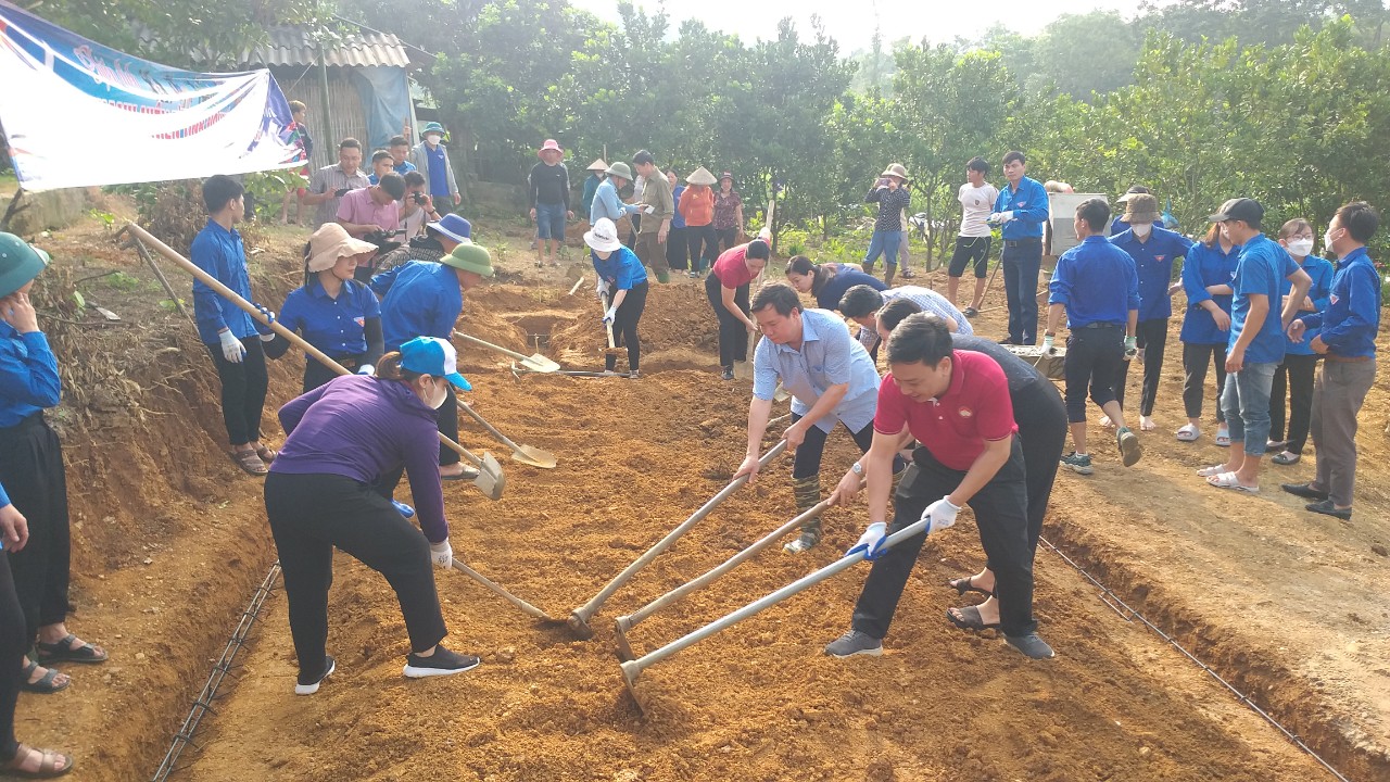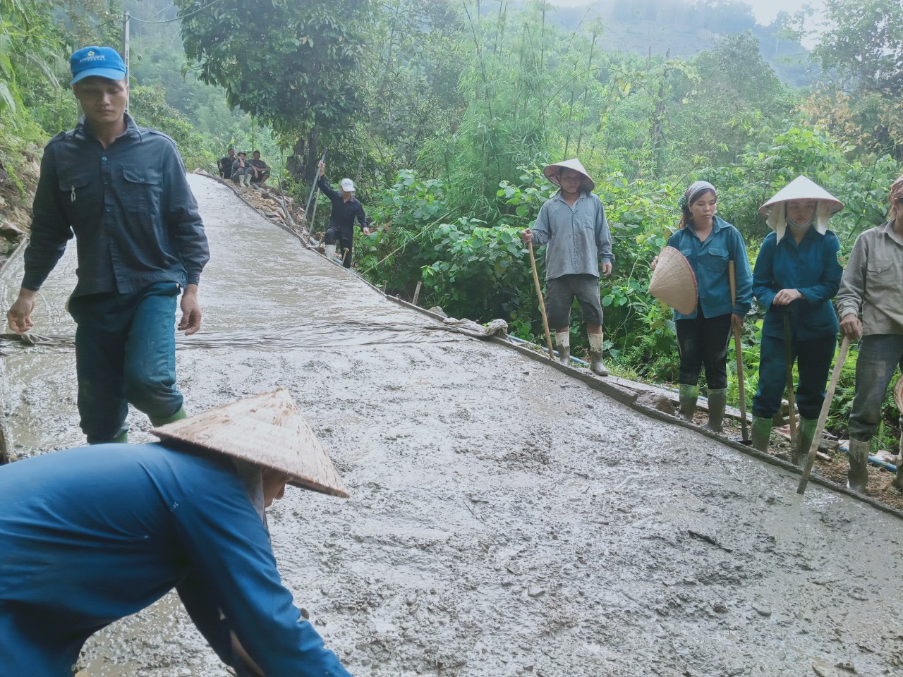 Cán bộ công chức xã Yên Thuận, huyện Hàm Yên tham gia đổ đường bê tông liên thôn.