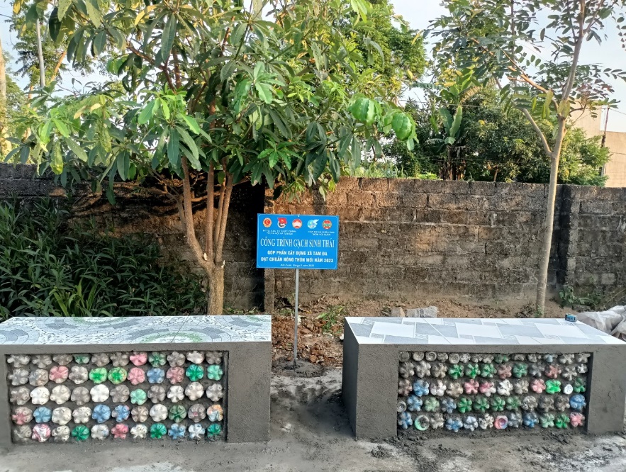 Mô hình làm ghế bằng gạch sinh thái của hội viên hội phụ nữ thôn Phú Xuân, xã Tam Đa, huyện Sơn Dương