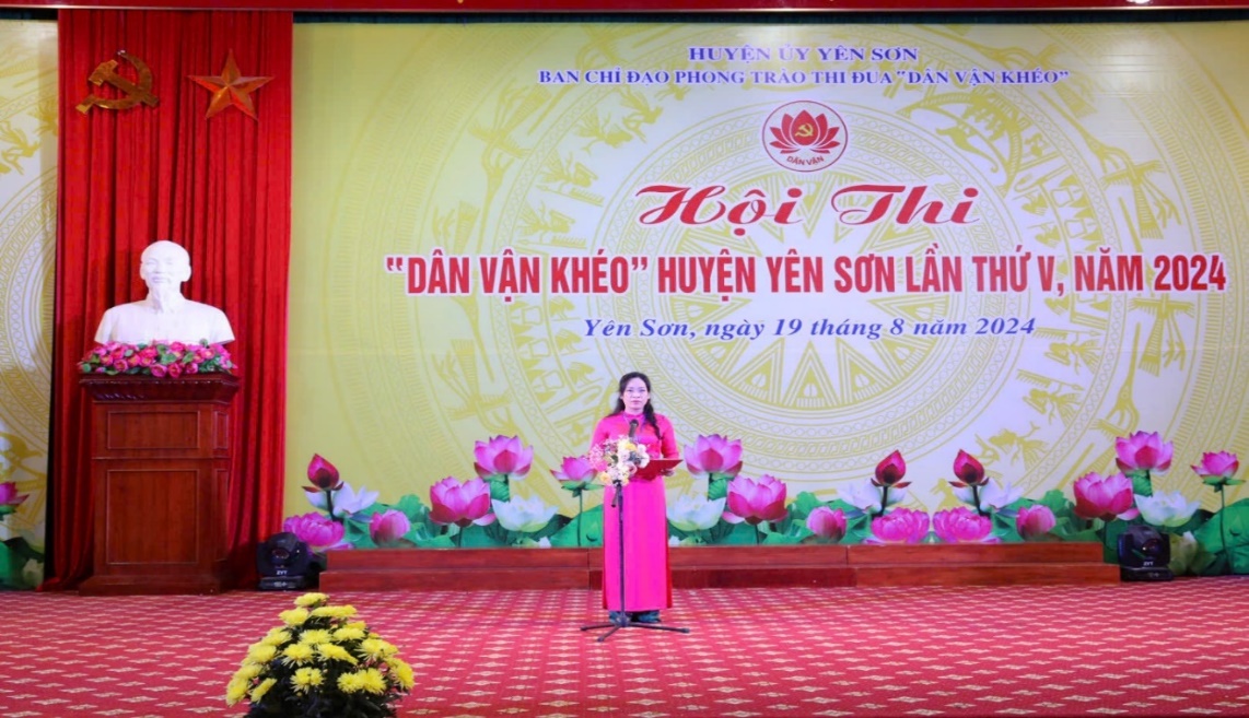 Sáng ngày 19/8/2024, Ban Chỉ đạo Phong trào thi đua "Dân vận khéo" huyện Yên Sơn tổ chức Hội thi "Dân vận khéo" lần thứ V, năm 2024. Đến dự có các đồng chí: Vương Thúy Hằng, Phó trưởng Ban Dân vận Tỉnh ủy; Đỗ Hùng Đức, Quyền Bí thư Huyện ủy; Nguyễn Hữu Phương, Phó Bí thư Huyện ủy, Chủ tịch UBND huyện; các đồng chí Ủy viên BTV Huyện ủy; lãnh đạo các phòng, ban, ngành, tổ chức chính trị - xã hội huyện; Bí thư Đảng ủy, Chủ tịch UBND, Trưởng khối dân vận, Chủ tịch Ủy ban MTTQ, trưởng các tổ chức chính trị - xã hội; các xã, thị trấn; đại diện lãnh đạo các chi bộ cơ sở và nhân dân đến tham gia cổ vũ.