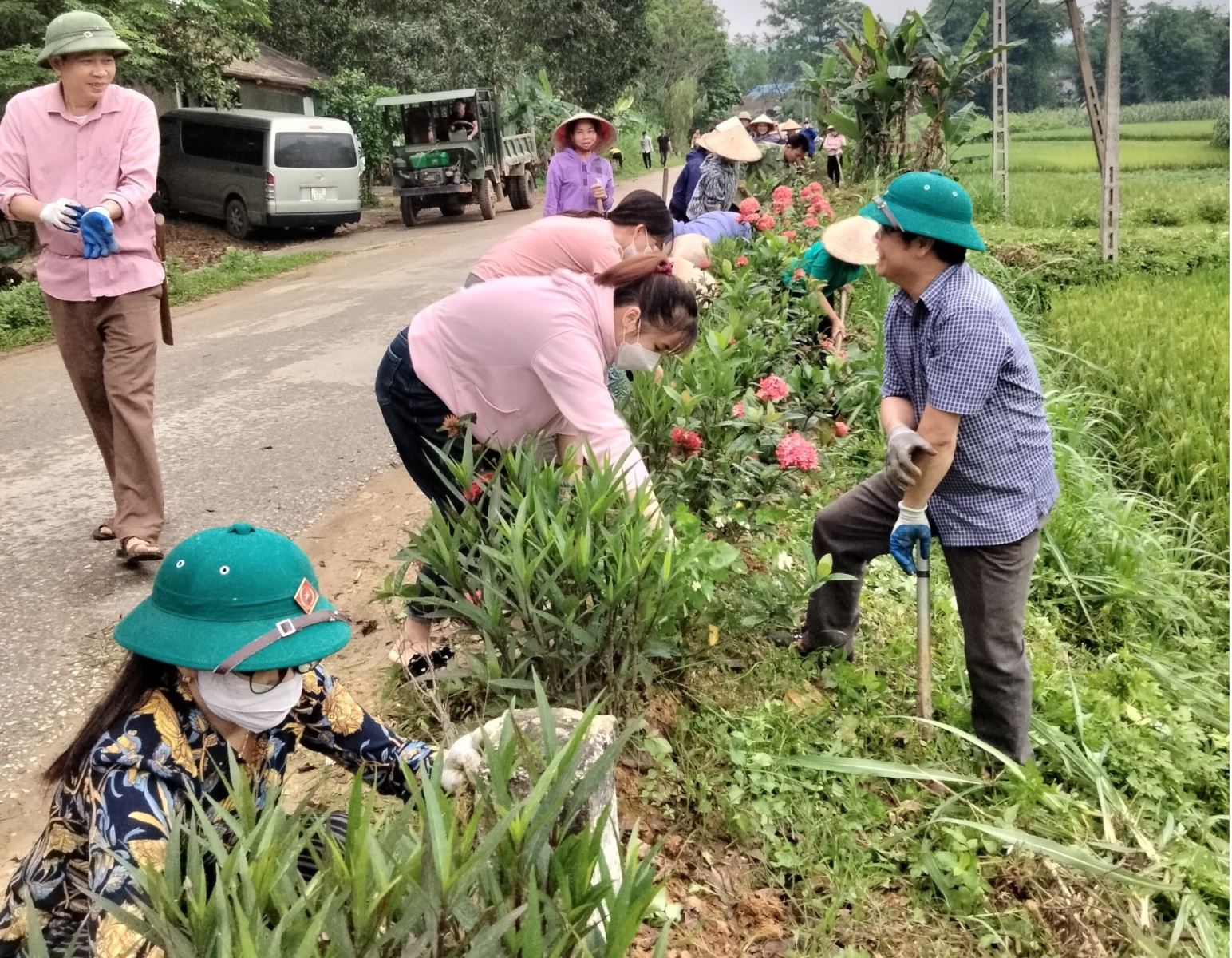 Cán bộ, đảng viên xã Minh Hương, huyện Hàm Yên tham gia cùng Nhân dân thôn 12 Minh Quang, chăm sóc tuyến đường hoa