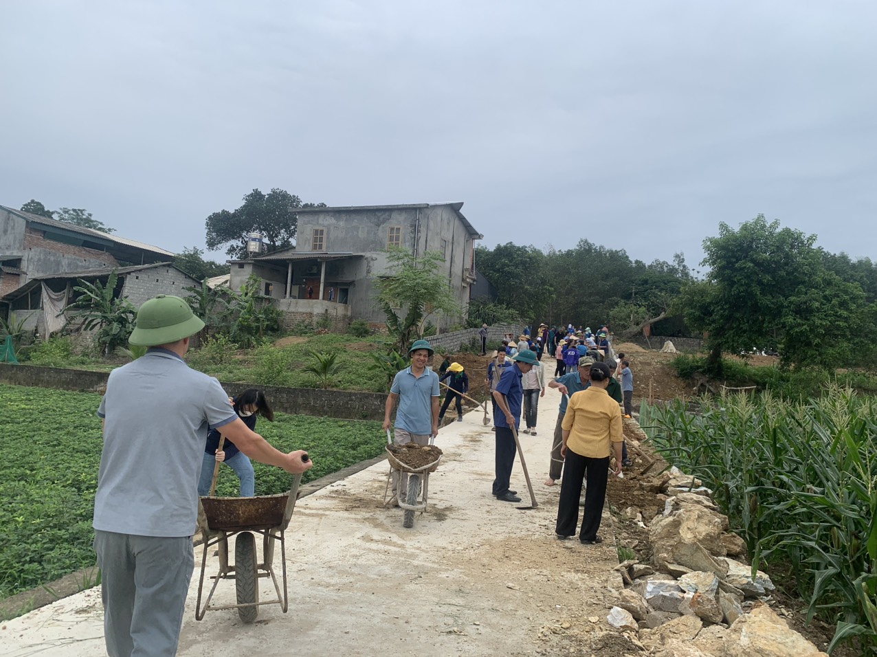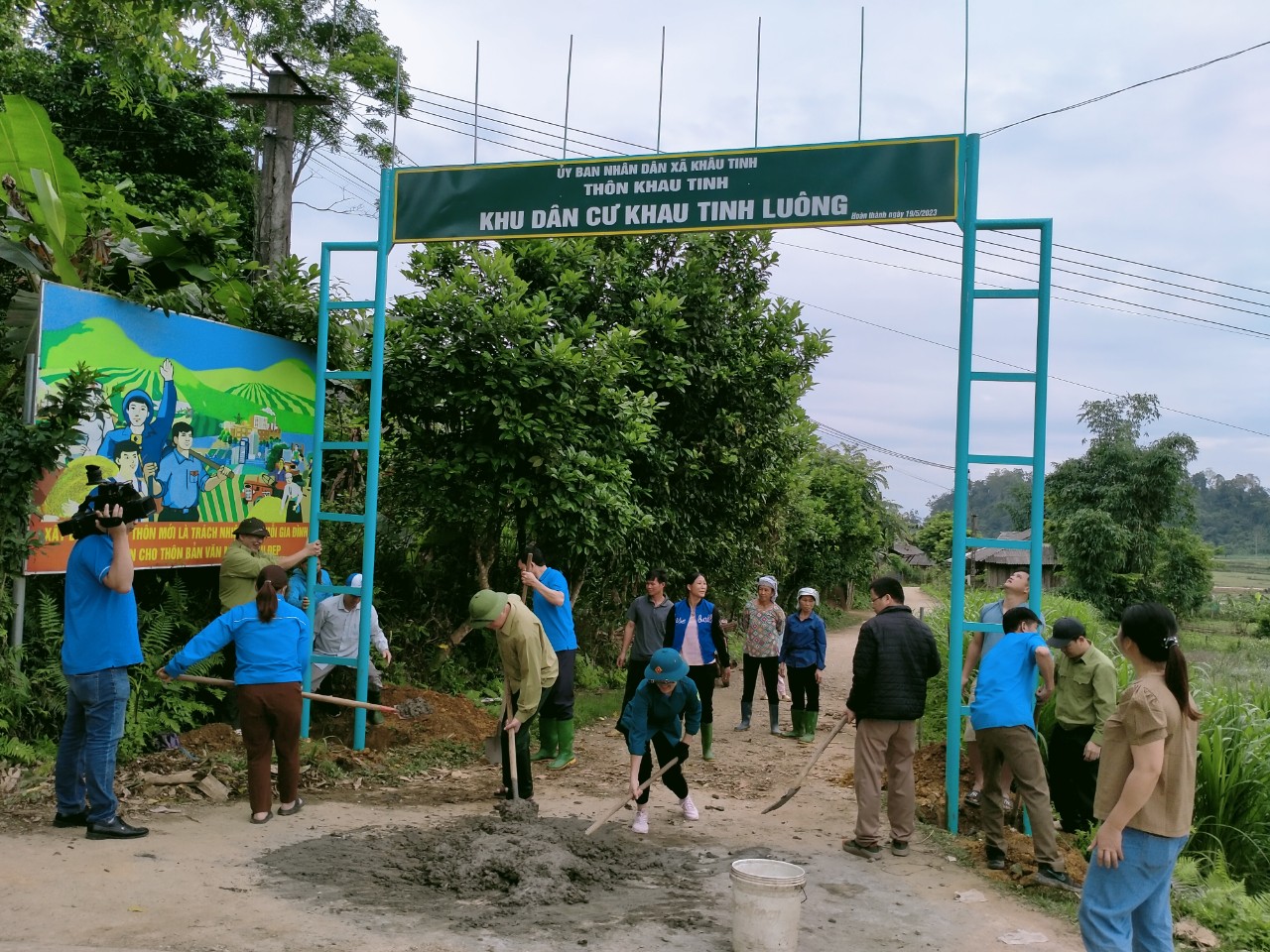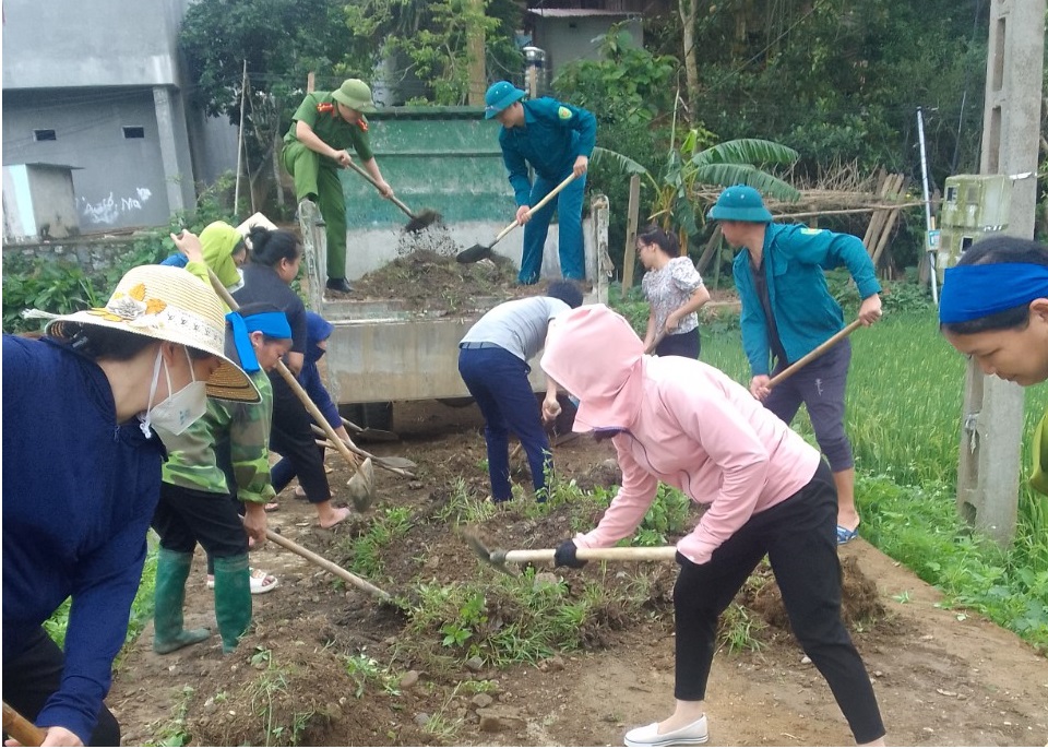 Cán bộ công chức xã Cấp Tiến, huyện Sơn Dương tham gia cùng Nhân dân thôn Tiến Thắng, đắp hoàn mang đường bê tông và vệ sinh đường làng ngõ xóm