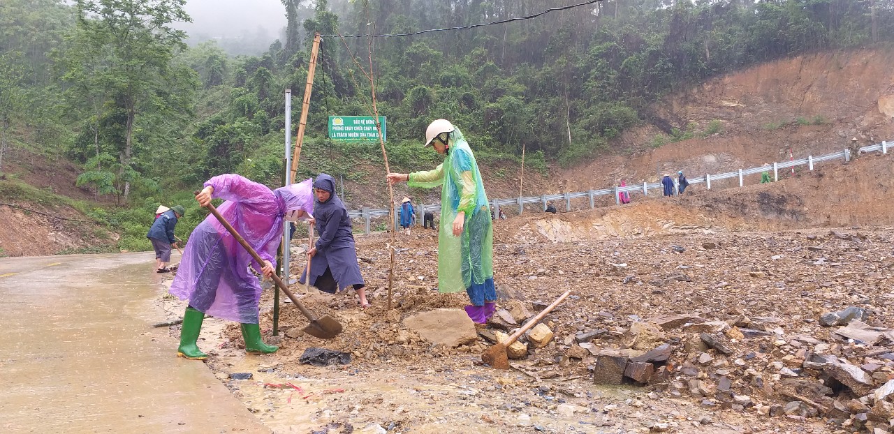 Cán bộ, công chức Sở Nội vụ, Đảng bộ cơ quan Chính quyền huyện Lâm Bình, cấp ủy, chính quyền xã Bình An tham gia cùng Nhân dân thôn Tống Pu, tu sửa, vận chuyển cát sỏi khắc phục hậu quả do mưa lũ
